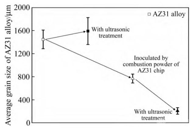 图5和6所示,分别为AZ31镁屑燃烧粉末孕育处理AZ31合金的晶粒形貌和晶粒尺寸变化。经过AZ31镁屑燃烧粉末孕育处理,AZ31合金晶粒发生明显细化,相应平均晶粒尺寸由1447μm下降至768μm。采用超声协同AZ31镁屑燃烧粉末孕育处理,AZ31合金晶粒进一步被细化,平均晶粒尺寸由768μm下降至207μm。图5 AZ31镁屑燃烧粉末孕育处理AZ31合金晶粒形貌图6 AZ31镁屑燃烧粉末孕育处理AZ31合金平均晶粒尺寸