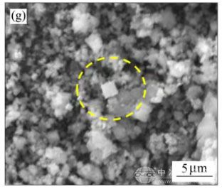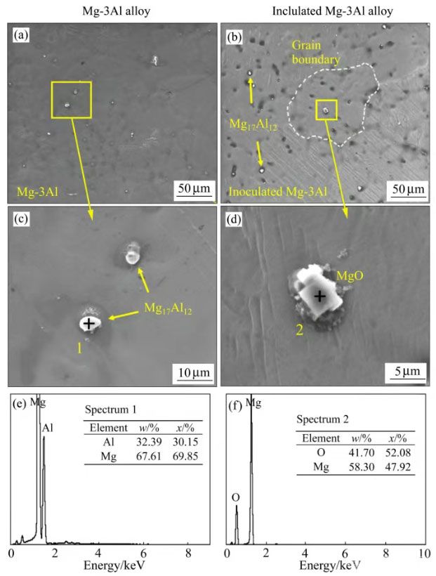 为揭示镁屑燃烧粉末孕育细化Mg合金机理,采用扫描电子显微镜对孕育前后Mg-3Al合金进行微观组织观测。图7所示为纯Mg镁屑燃烧粉末孕育前后Mg-3Al合金的SEM形貌与EDS结果。经过孕育处理,燃烧氧化夹杂颗粒被引入到Mg-3Al合金内部。由EDS结果可知,孕育Mg-3Al合金a-Mg晶粒中心区域的夹杂颗粒Mg、O摩尔比接近1:1。结合XRD结果,所观测到的氧化夹杂颗粒应为MgO。图7(g)所示为镁屑燃烧粉末氧化夹杂颗粒,与孕育细化Mg-3Al合金晶粒中心的夹杂颗粒形貌一致。根据经典形核理论,当合金熔体中存在有效的异质形核基底,晶粒优先在异质颗粒表面上形核与长大,被激活成核的异质颗粒总是位于相应晶粒中心区域位置。因此,观测到的位于晶粒中心区域位置的MgO颗粒,应被视为晶粒的形核核心。图7 未孕育Mg-3Al合金(a-c)和纯Mg镁屑燃烧粉末孕育Mg-3Al合金(d-l)SEM和EDS结果