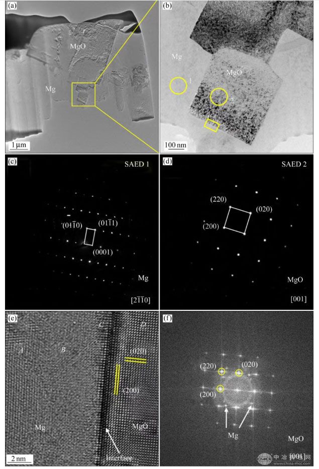 图8 晶粒中心区域的MgO颗粒连同α-Mg基体TEM明场像、选区电子衍射花样、MgO/α-Mg 界面高分辨照片及快速傅里叶变换照片