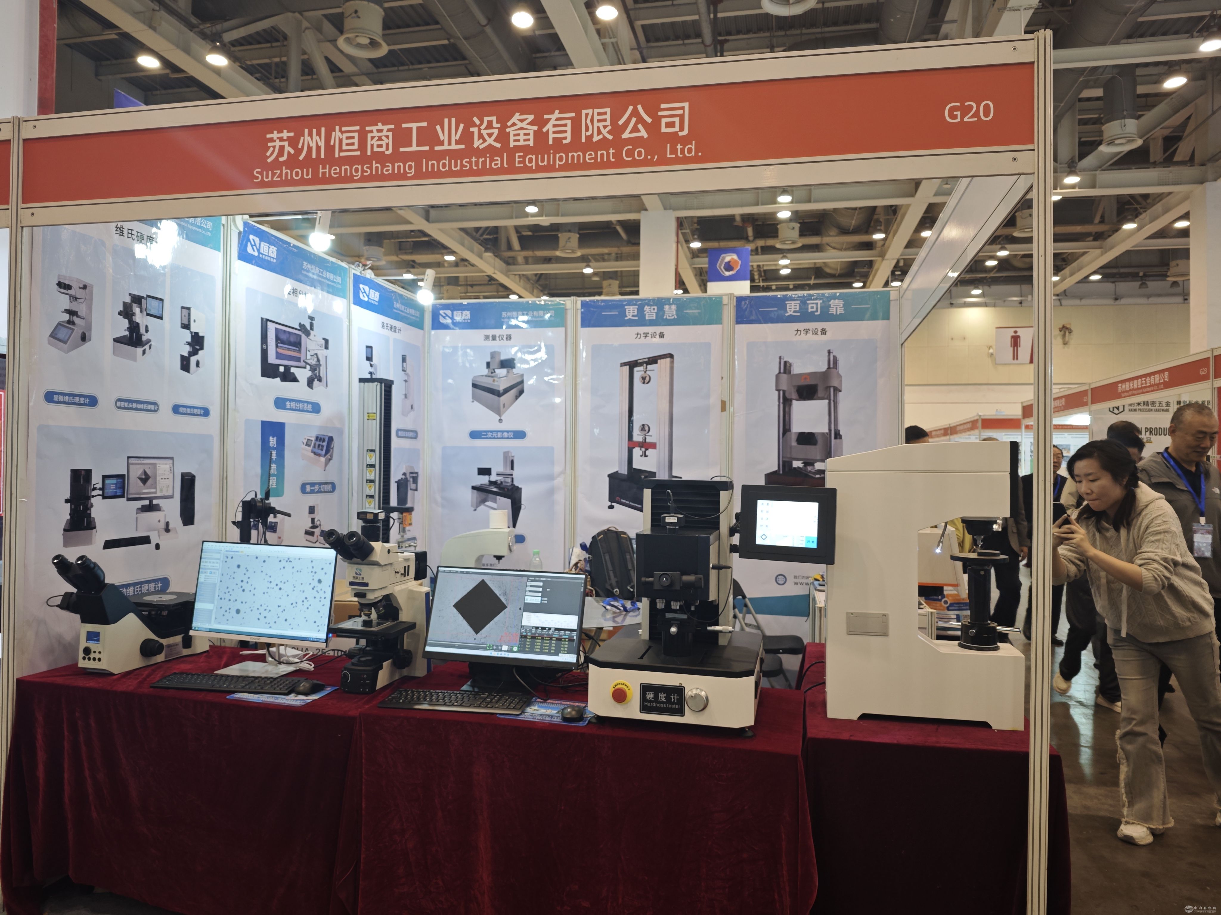 应用场景,吸引海内外专业观众超万人次,是行业技术交流与商贸对接的重要平台。苏州恒商紧扣展会“智能制造”主题,重点展示全自动数显硬度计、金相显微镜及拉力试验机等拳头产品。其中MHRS-150/45-Z PLUS硬度计凭借0.1HR的高分辨率和1.75秒快速测试能力,成为现场焦点,其性能适配新能源汽车零件的高精度检测需求。