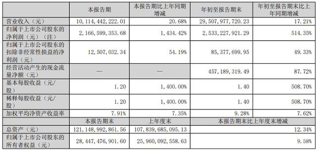 根据最新公告,该公司Q3单季度营收规模突破百亿大关,达到101.14亿元,较去年同期提升20.68%;值得注意的是,其归母净利润呈现爆发式增长,录得21.67亿元,同比增幅高达1434.42%;扣除非经常性损益后的净利润为1250.70万元,同比增长54.19%。从累计数据看,1-9月累计营收295.08亿元,同比增长17.21%;合计归母净利润25.33亿元,同比激增514.35%;扣非净利润8537.77万元,增长率为49.33%。
