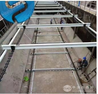 是一种刮泥设备,可适用于矩形初沉池与二沉池内表面撇渣与底部刮泥操作,以及各种池体形状的表面撇渣,近几年来在水处理行业中已得到广泛应用。该设备主要由刮泥板、链条、链轮和驱动装置等组成。驱动电机、减速机输出扭矩经过驱动链和链轮传送到刮泥机主轴,主轴链轮驱动铺设于沉淀池两侧的链条做回转运动,刮泥板两端分别安装在两侧的链条上,由从动轮及导轨支撑,去程于池底刮泥,回程于池面撇渣。
