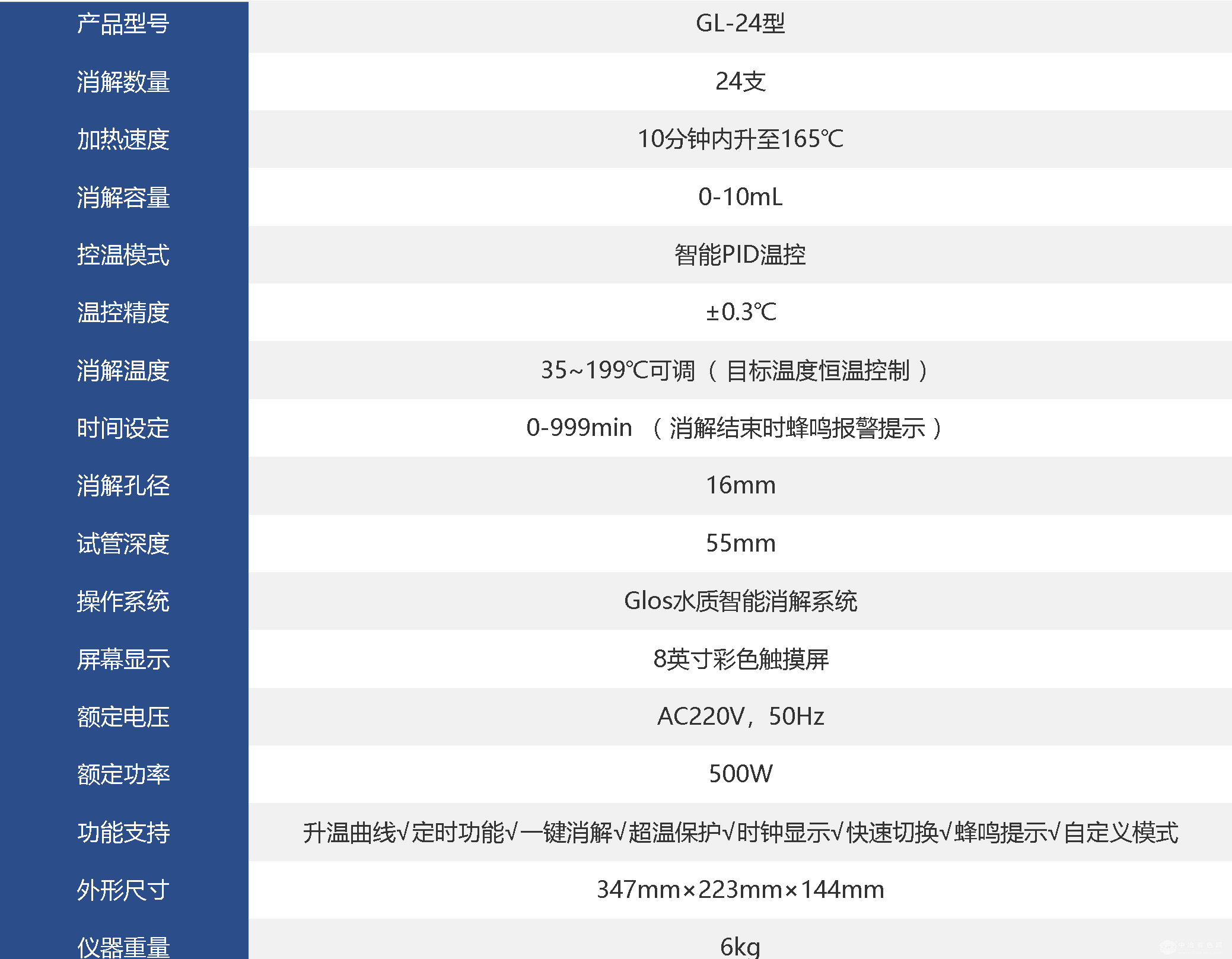 GL-24 双温区COD消解仪,具备两个温区可独立运行,同时消解2种不同的项目,极大缩短了多项目消解时长,消解效率翻倍提升。GL-24 双温区COD消解仪,搭载“Glos智能消解系统",配备8寸高清触摸屏,并实时显示消解控温曲线,明确消解过程中的温度变化,具有更好的智能操作体验