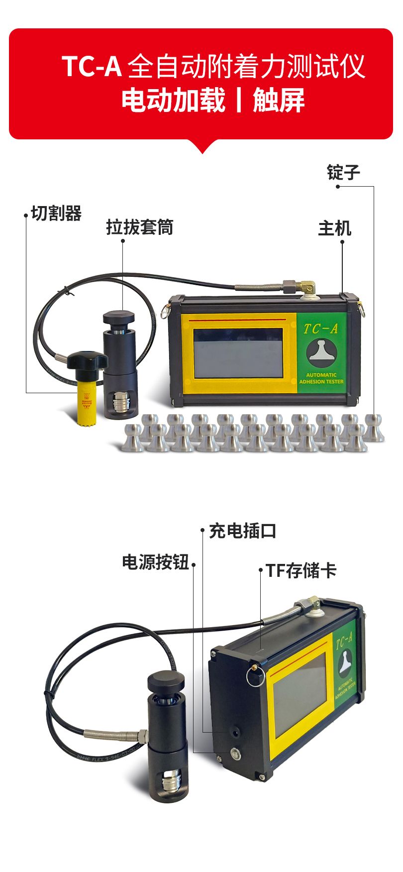 2、TC-A 电动附着力测试仪: 支持加载力值与拉拔时间自由设定(约 11,000 - 13,000 元/台)。推荐用于行业标准对这两项参数有明确规定的测试需求。